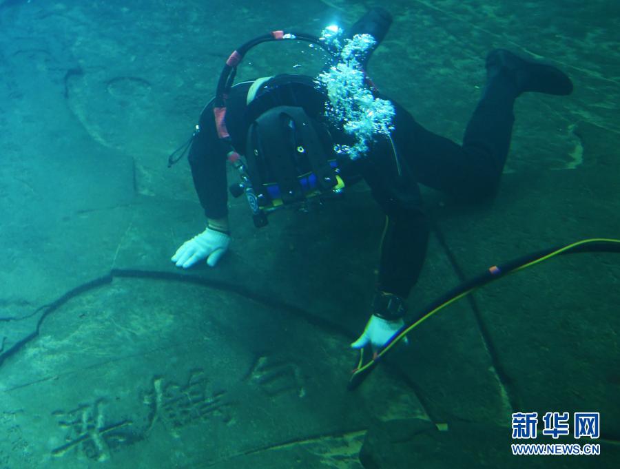 3月15日,在長(zhǎng)江水下40多米的白鶴梁題刻無(wú)壓容器罩內(nèi),潛水員在對(duì)題刻上的泥沙進(jìn)行清理。新華社記者 王全超 攝