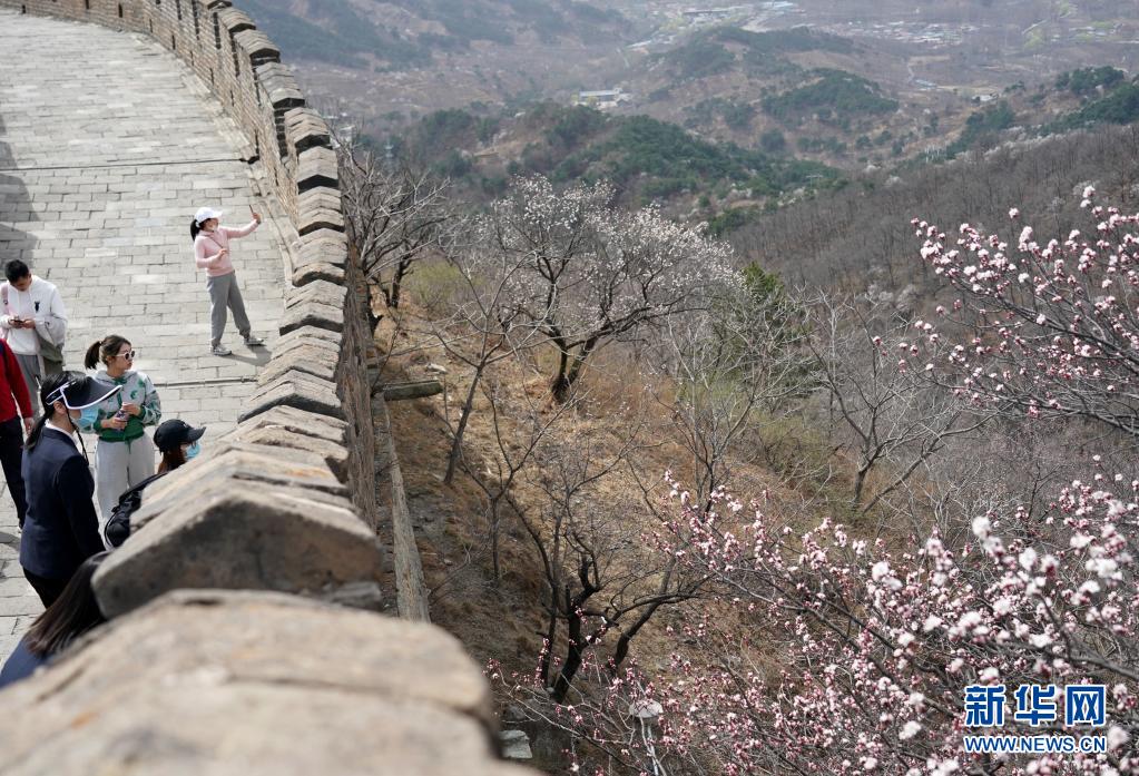 3月31日,游客在北京慕田峪長城游玩賞春。