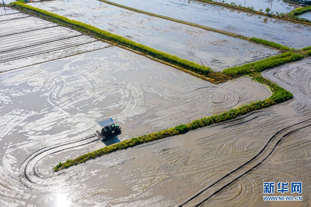 4月5日,浙江寧波余姚市黃家埠鎮(zhèn)韓夏村村民駕駛農(nóng)機(jī)在田間耕地(無(wú)人機(jī)照片)。