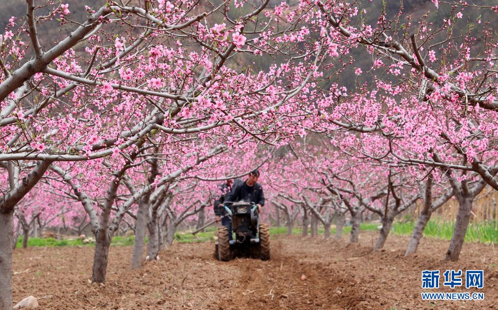 4月5日,河北省石家莊市井陘縣測魚鎮(zhèn)楊莊村村民駕駛農(nóng)機(jī)在桃園里作業(yè)。