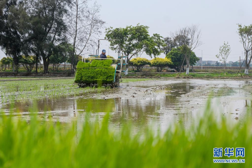 4月5日,在福建省石獅市科技種子試驗場,農(nóng)民駕駛插秧機(jī)在田里插秧。