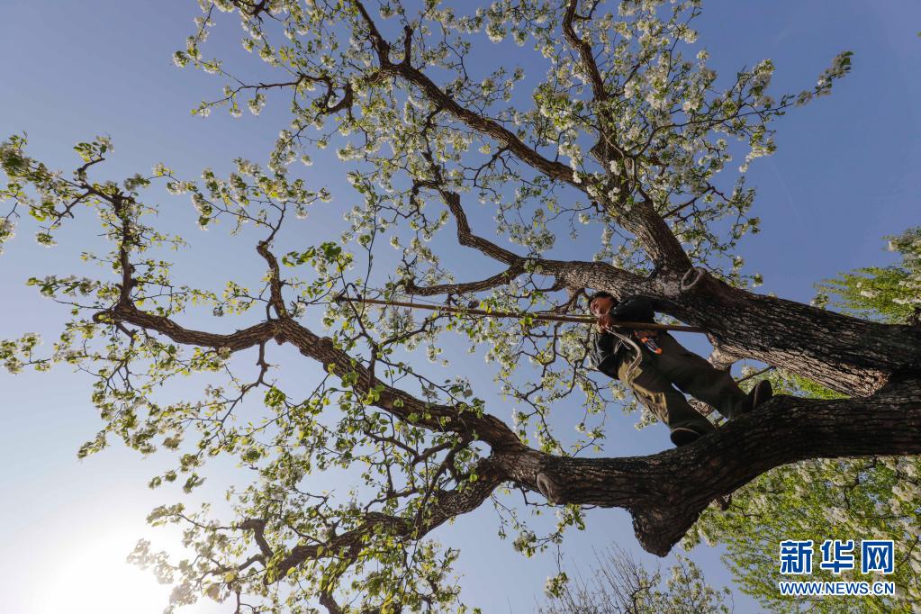 4月6日,河北唐山遵化市鐵廠鎮(zhèn)東平臺村的農(nóng)民在果園管護(hù)梨樹。