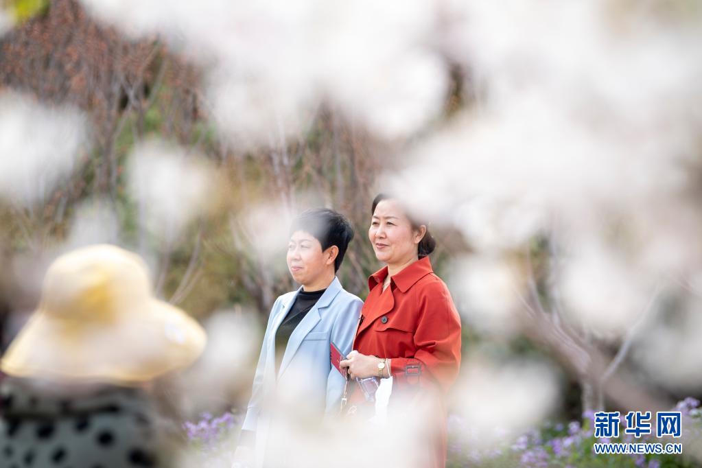 4月7日,游人在山西省太原市玉泉山城郊森林公園拍照留念。近日,山西省太原市玉泉山城郊森林公園栽植的近25萬株各類櫻花競(jìng)相盛開,吸引不少市民前來觀賞。新華社記者 楊晨光攝
