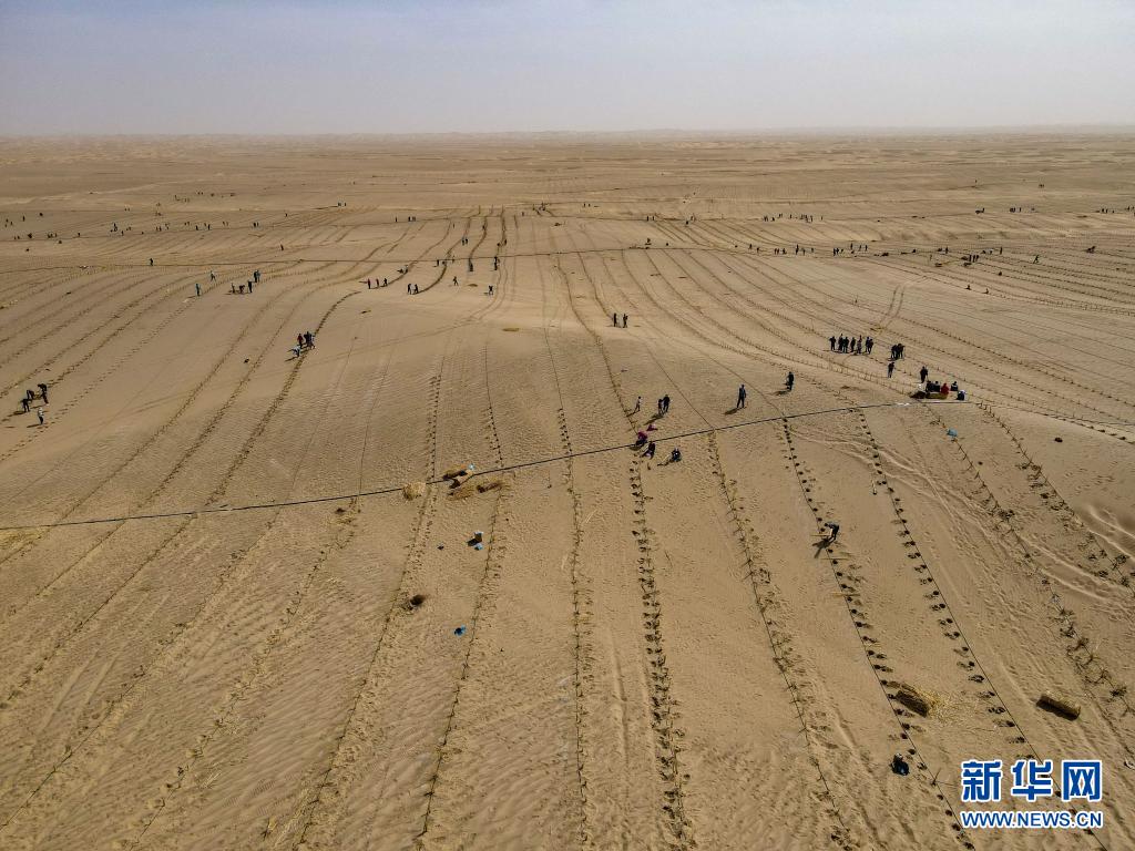 這是在新疆且末縣城不遠(yuǎn)處的塔克拉瑪干沙漠內(nèi)植樹的群眾(3月28日攝,無人機照片)。新華社記者 高晗 攝