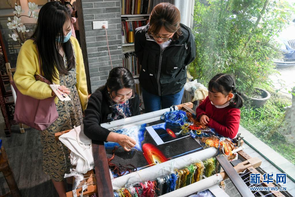 在位于蘇州高新區(qū)鎮(zhèn)湖街道的蘇繡工作室內,陳英華(右三)為前來參觀的客人展示蘇繡技法(4月14日攝)。新華社記者 李博 攝