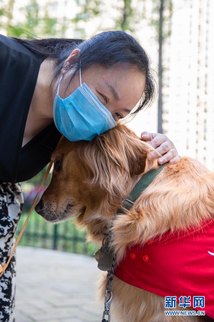 生活在南京市建鄴區(qū)的陳冬梅與導(dǎo)盲犬“果凍”在一起(4月4日攝)。 新華社發(fā) (張夢 攝)