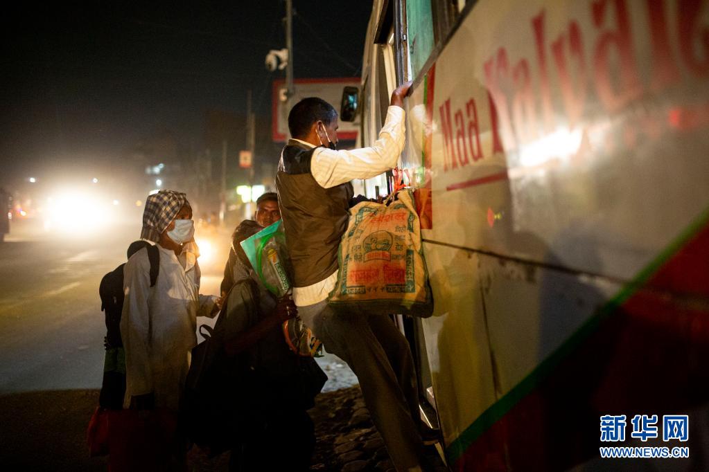 4月29日凌晨,人們在尼泊爾首都加德滿都登上長途客車,準(zhǔn)備在封禁措施實施前離開加德滿都返回家鄉(xiāng)。