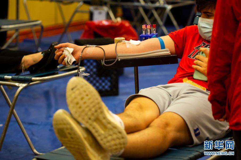 6月14日,在美國紐約州長(zhǎng)島地區(qū)的尤寧代爾,獻(xiàn)血志愿者在美國紐約血液中心舉行的獻(xiàn)血活動(dòng)上獻(xiàn)血。