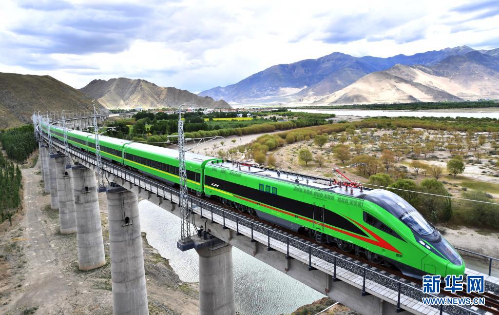 試運(yùn)行的復(fù)興號(hào)列車行駛在西藏山南市境內(nèi)(6月16日攝)。