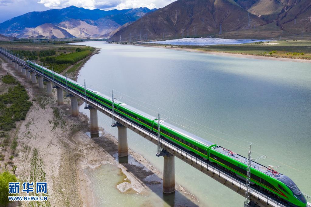 試運(yùn)行的復(fù)興號(hào)列車行駛在雅魯藏布江上(6月16日攝,無(wú)人機(jī)照片)。