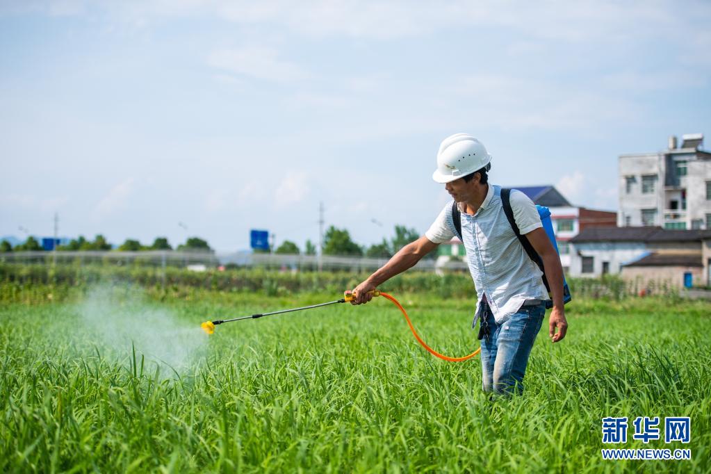 6月26日,湖南瀏陽(yáng)龍伏鎮(zhèn)新開村村民在田間打藥。