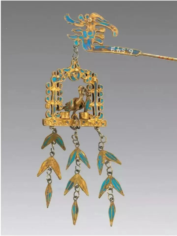 故宫博物院藏有一件清代“金镶珠石蝴蝶簪”,镶在蝶翅中央、充当蝶腹的正是一枚翠盈盈的金虫鞘翅。实际上,这件簪钗更准确的名字应该叫“金累丝镶玉虫珠石蝴蝶簪”。从古诗中的线索分析,这种工艺率先出现于中国,后传播到周边国家。