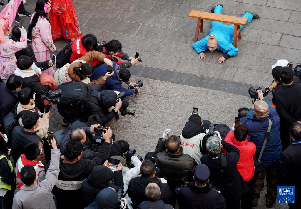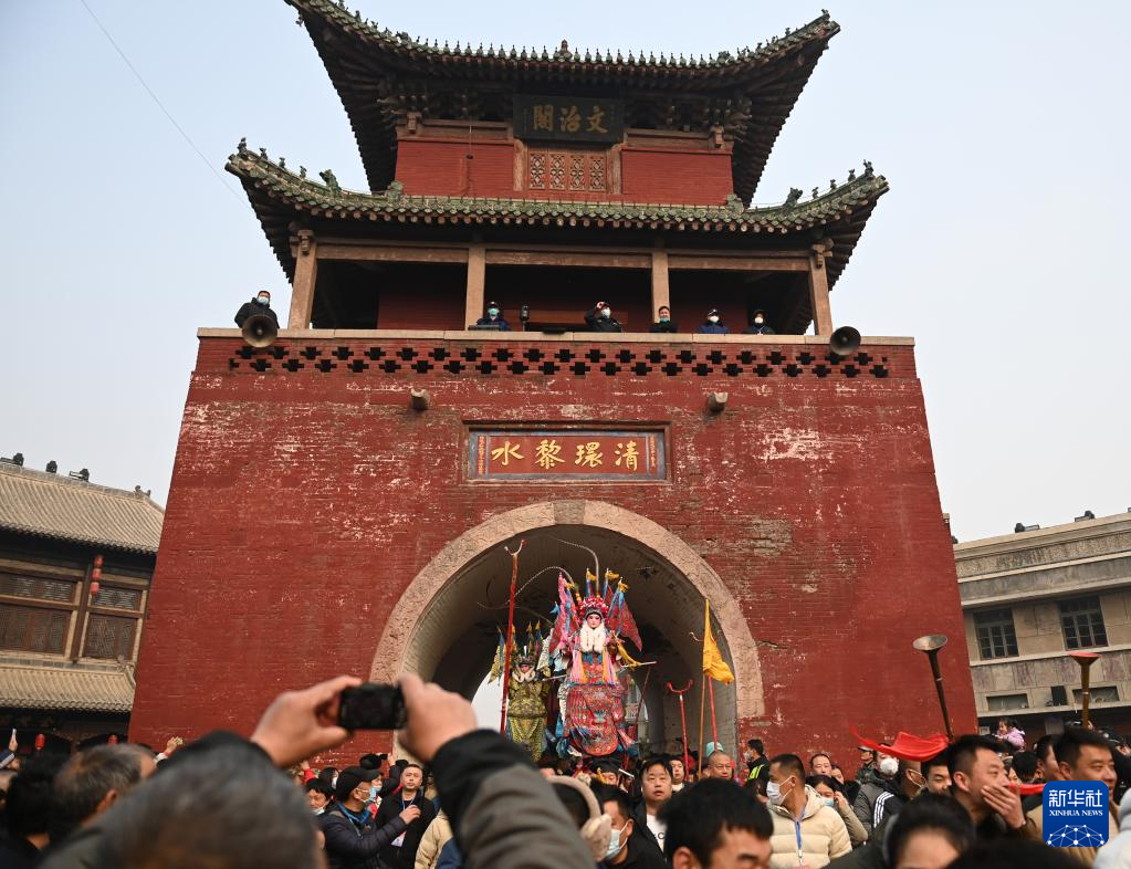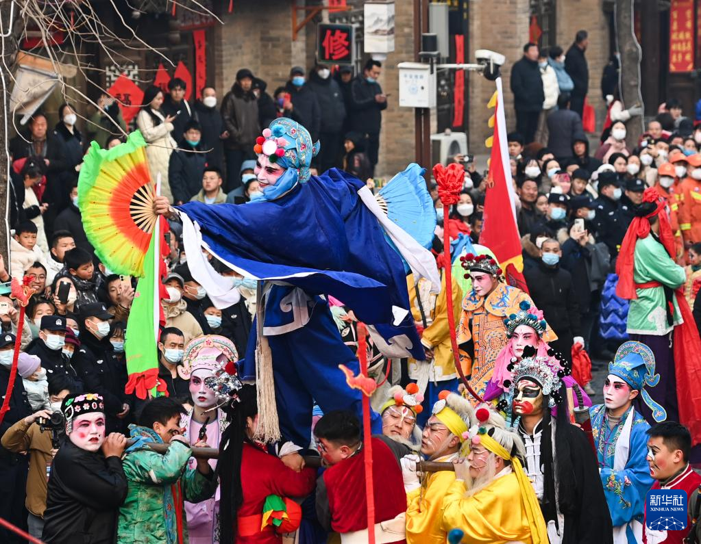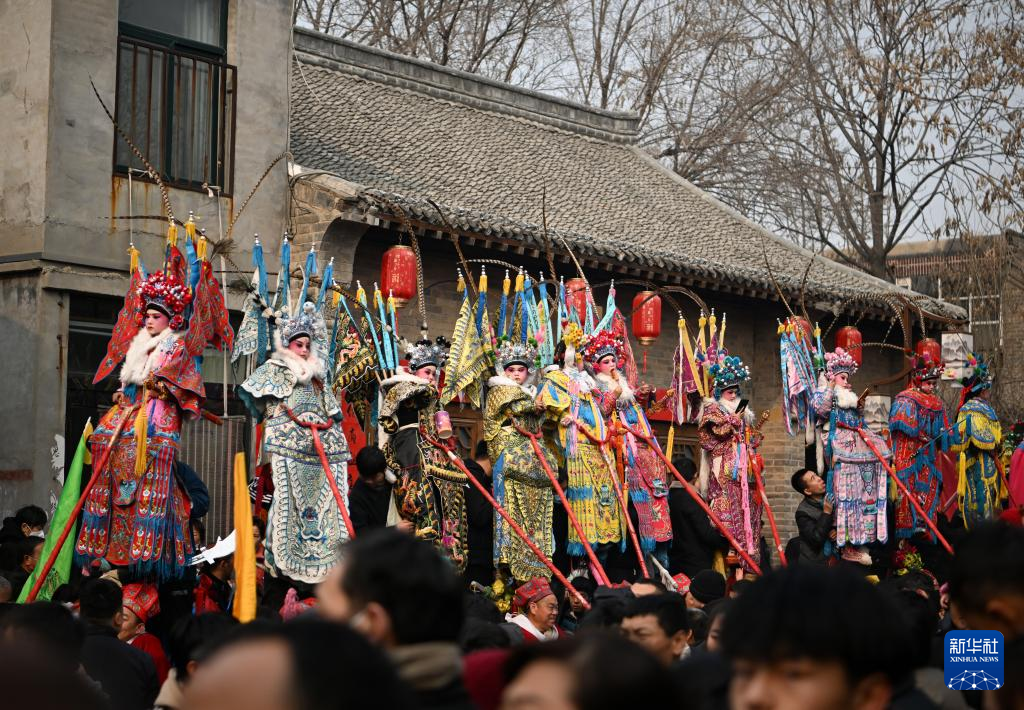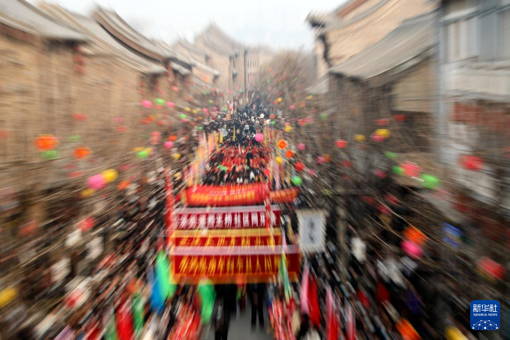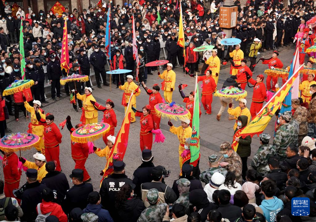 2月6日,社火团队的演员在庙会上表演(无人机照片)。