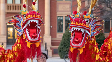 2月6日,人们在全椒县太平文化广场观看舞龙表演(无人机照片)。