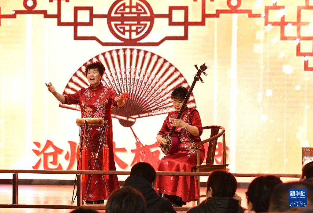 2月22日,木板大鼓艺人在沧州铁狮与旧城遗址公园为游客表演木板大鼓。