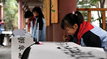3月23日,德清县洛舍镇中心学校的小学生在钢琴小镇的展示馆内弹奏钢琴。
