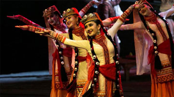 4月29日,在北京保利剧院,演员在音乐剧《拉齐尼·巴依卡》第一幕《帕米尔少年》中表演。