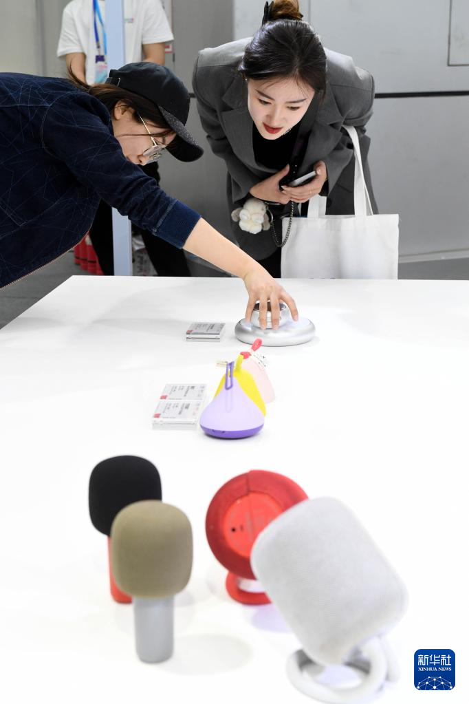 5月7日,在哈尔滨国际会展体育中心,观众在首届东北亚文化艺术创意设计博览会上参观选购。
