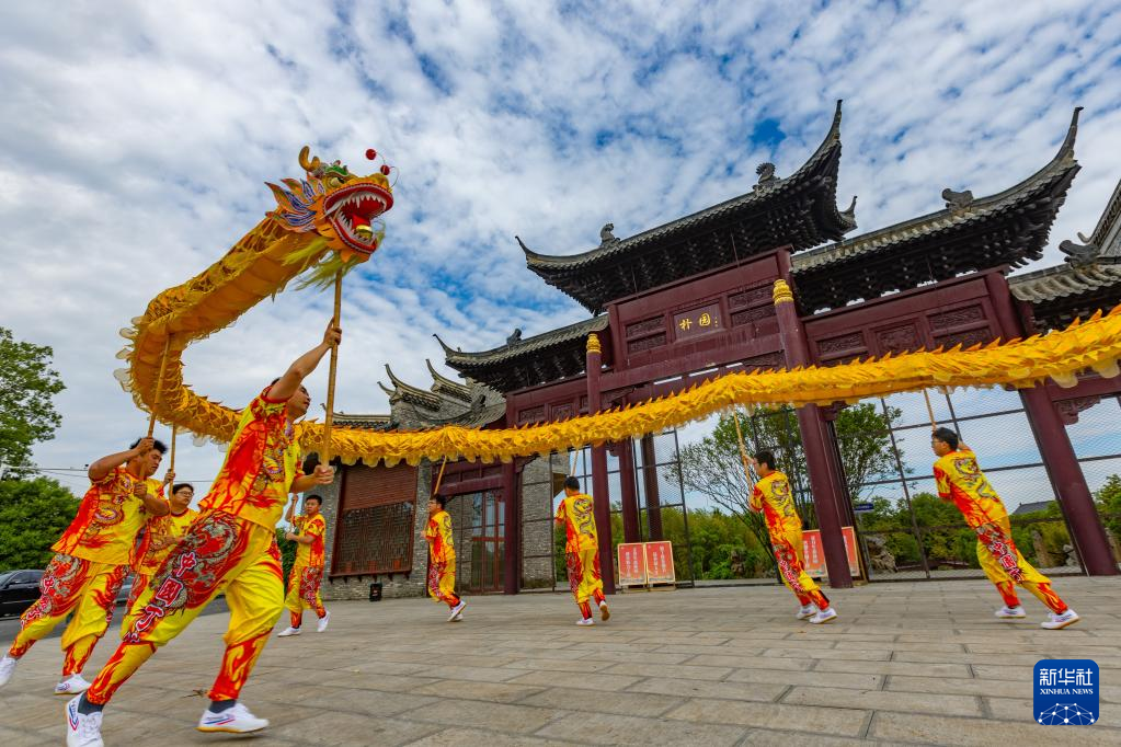 5月7日,江苏省级非遗项目丁伙龙舞表演队在江苏省扬州市江都区丁伙镇朴园表演。