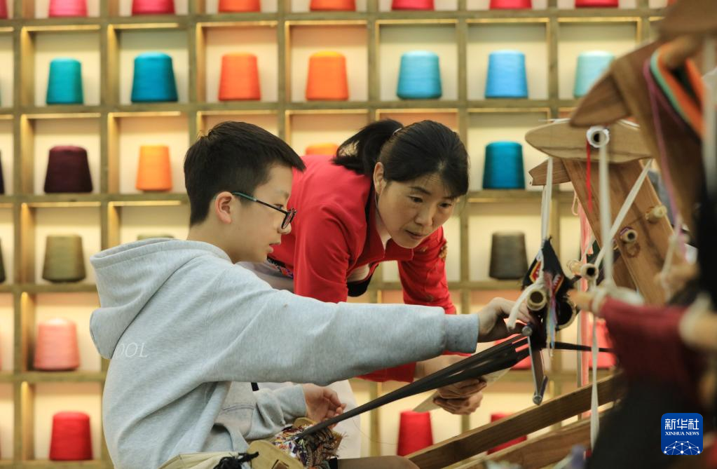 5月12日,来自上海包玉刚实验学校的学生在张家界市武陵源区乖幺妹土家族织锦基地学习体验土家族织锦非遗技艺。