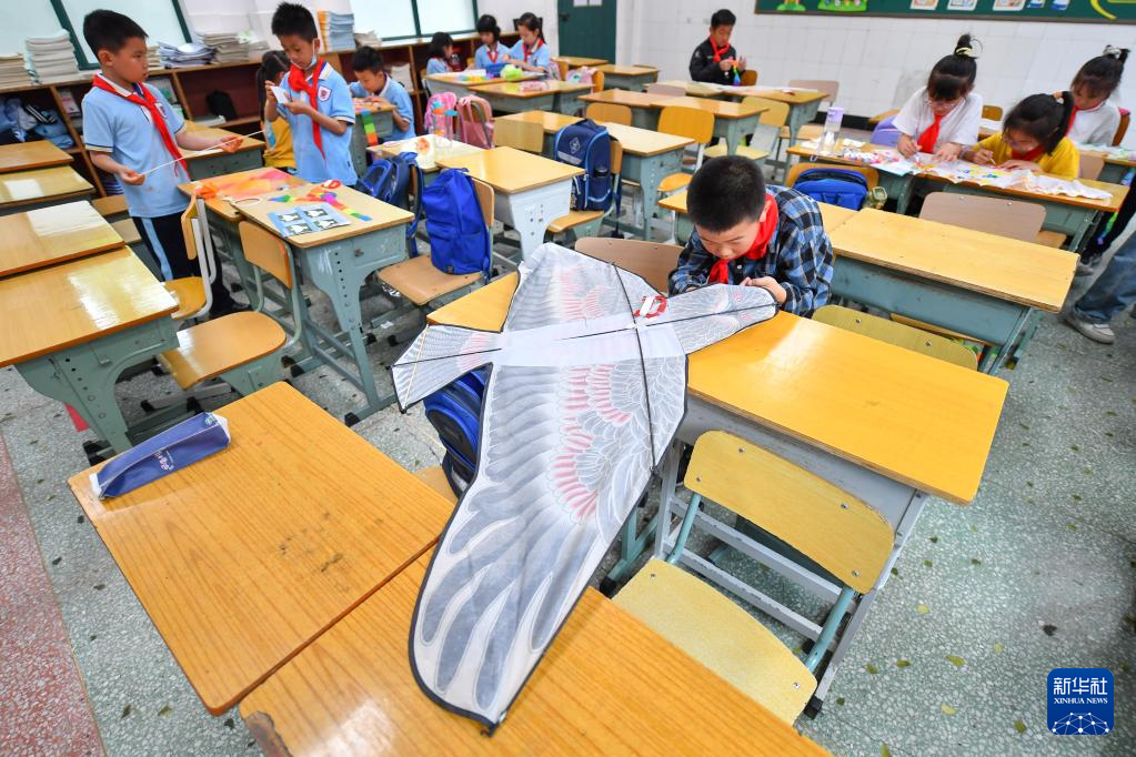 5月15日,在长沙市天心区红卫小学,学生在手工风筝课上体验风筝制作。