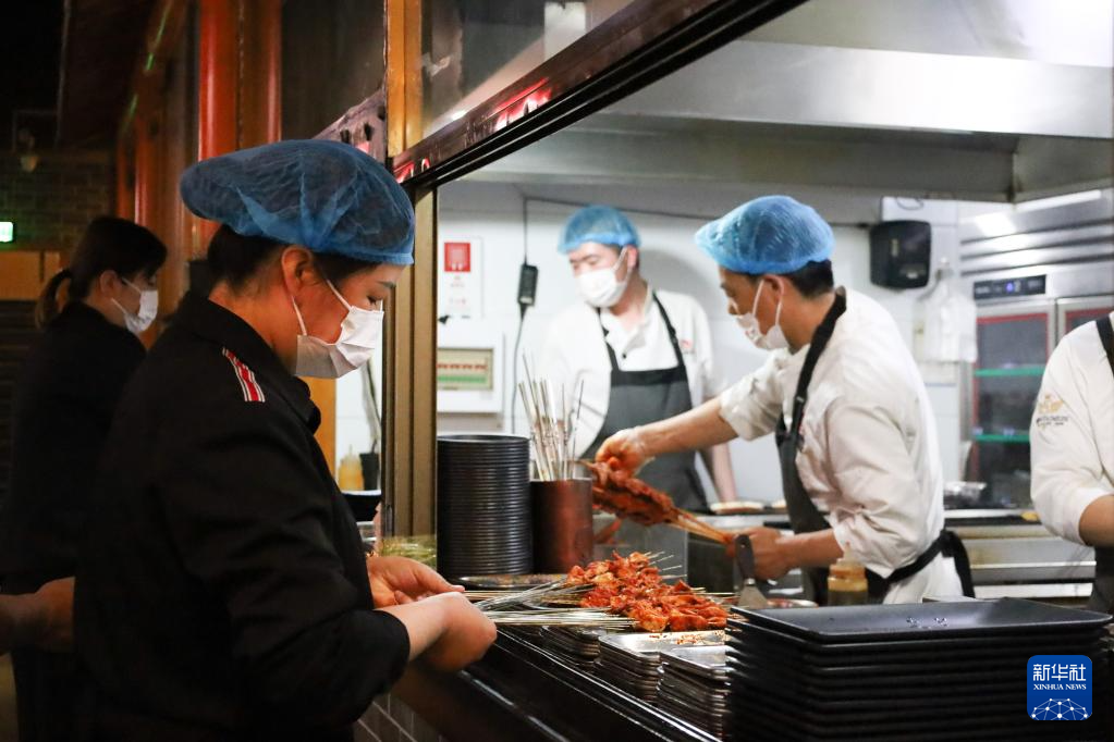 5月12日,在嘉峪关市的一家烤肉店,服务员在窗口取菜。