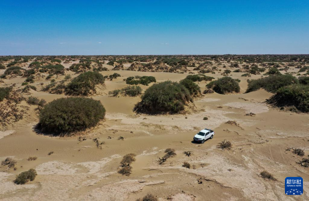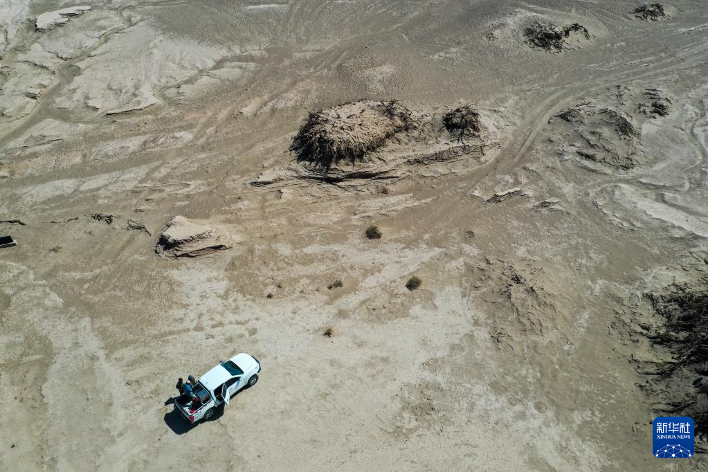 6月2日,额济纳旗文物保护中心工作人员在戈壁滩上巡护(无人机照片)。