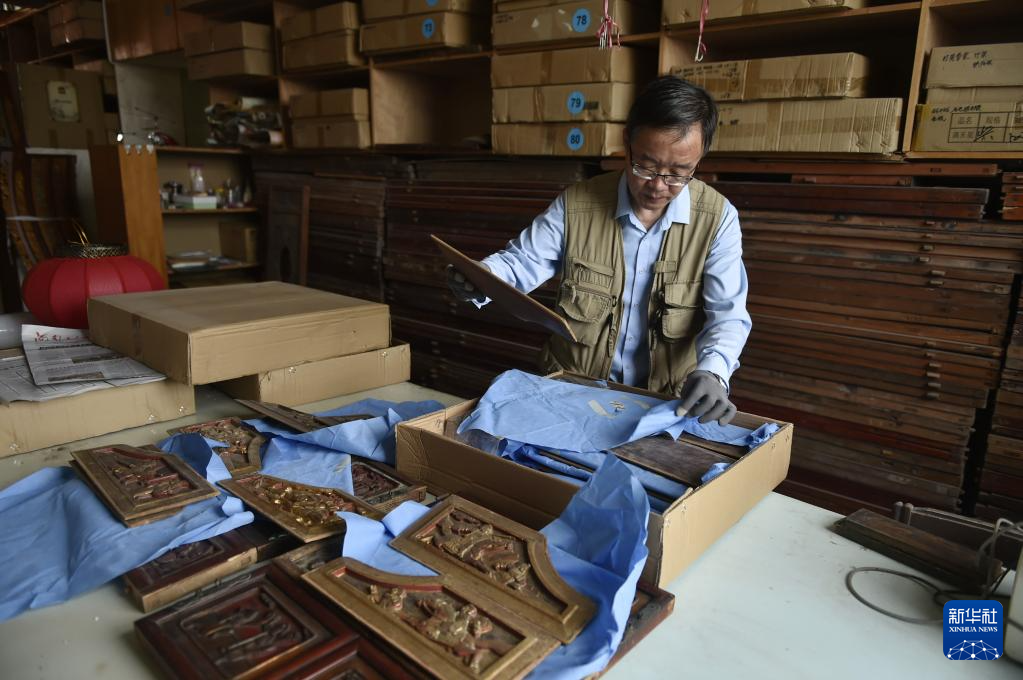 6月7日,张俊涛在库房内整理自己收集的家用传统木雕。
