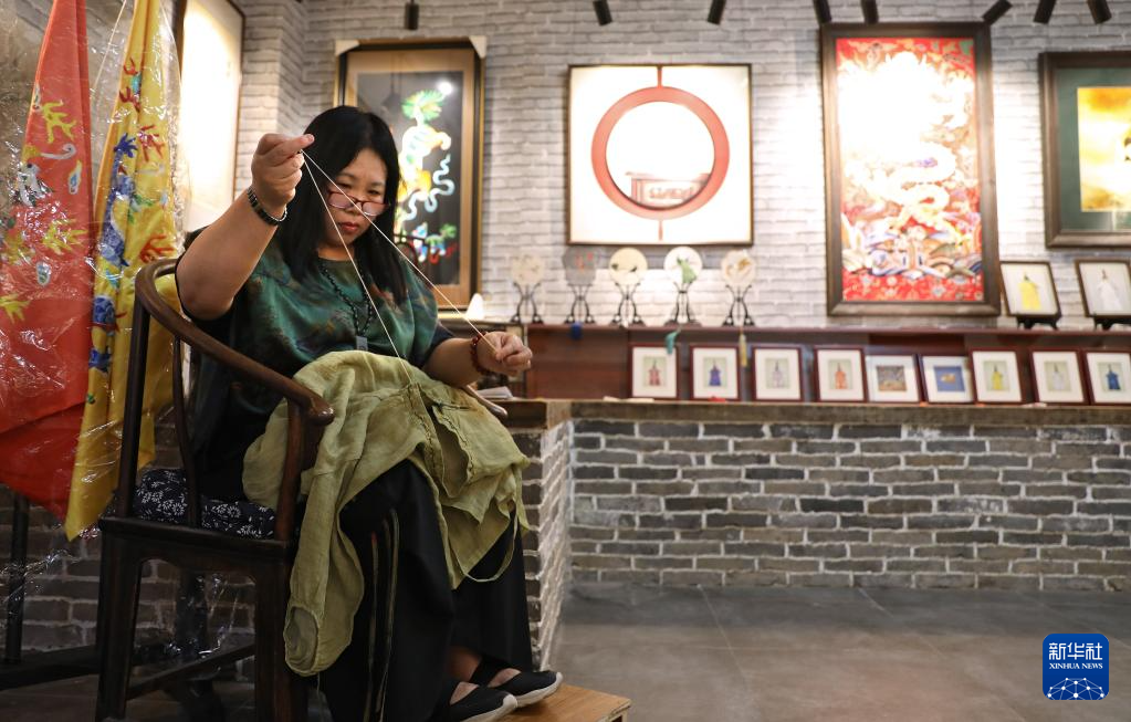 7月5日,王立君在位于辽宁省营口市辽河老街上的工作室里进行满绣创作。