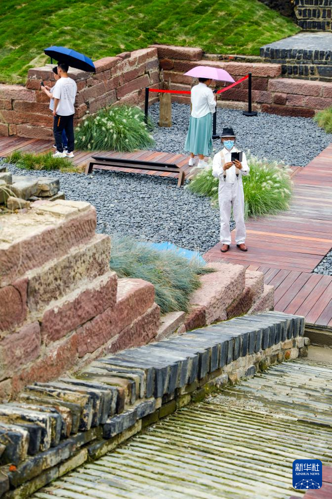 7月20日,在成都东华门遗址公园外场遗址区,人们在参观原状展示的明代蜀王府水道踏道遗迹。