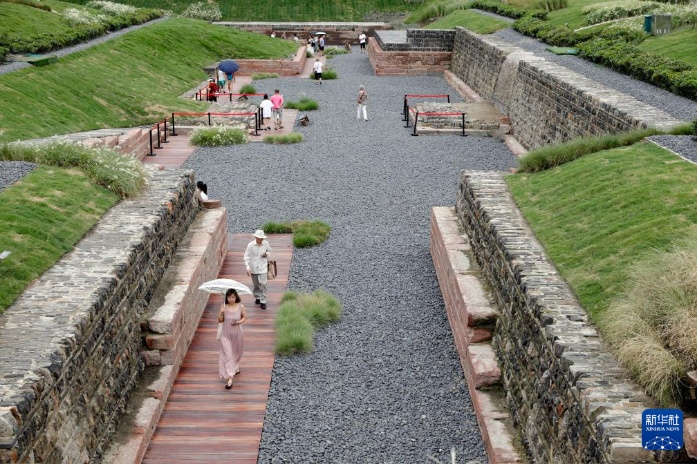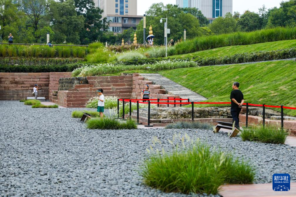 7月20日,在成都东华门遗址公园外场遗址区,人们在参观模拟展示的唐代庭院遗迹。