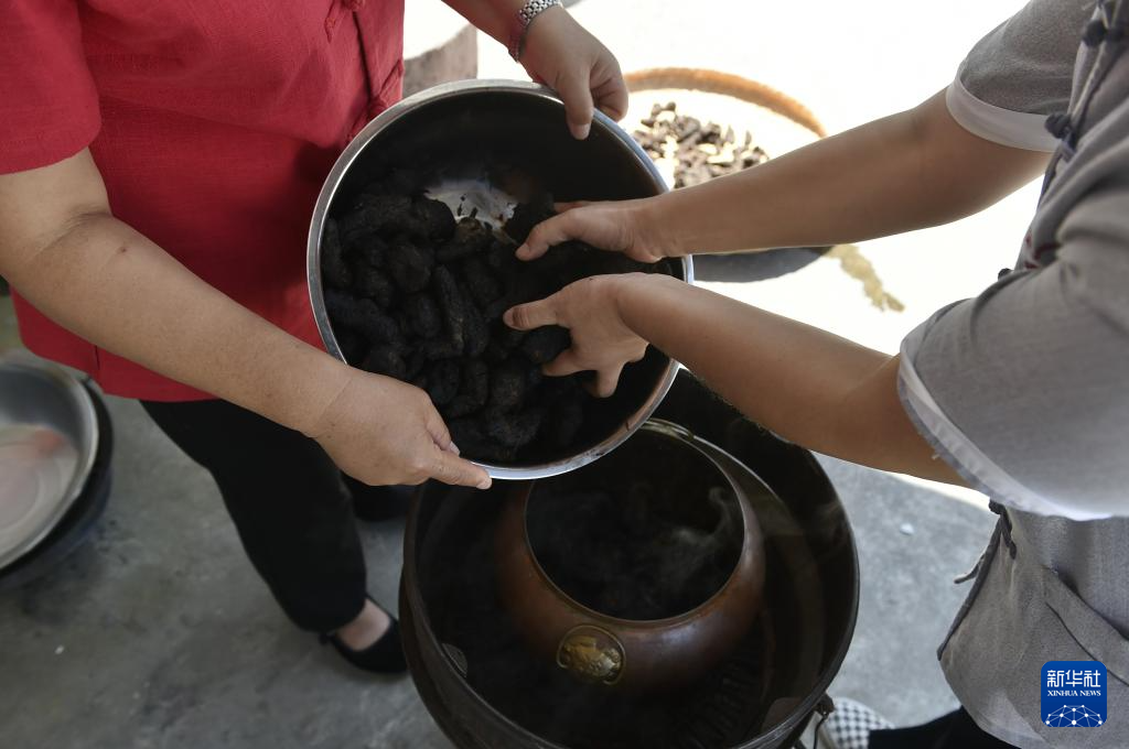 8月4日,在禹州中医药文化技艺传习馆,非遗项目“禹州中药加工炮制技艺”代表性传承人朱改莲(右)展示中药材“九蒸九晒”加工技艺。