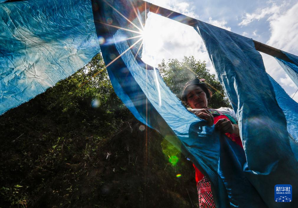 乌英苗寨妇女梁足英在晾晒第一次浸染后的布料(2023年8月31日摄)。