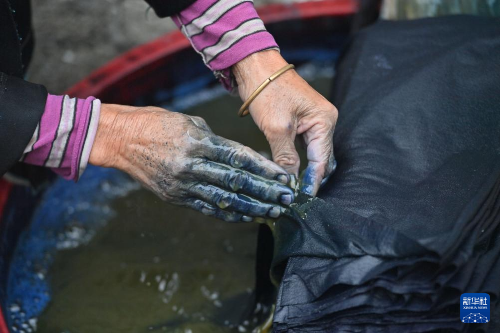 乌英苗寨妇女梁足英将白布浸染(2023年8月31日摄)。