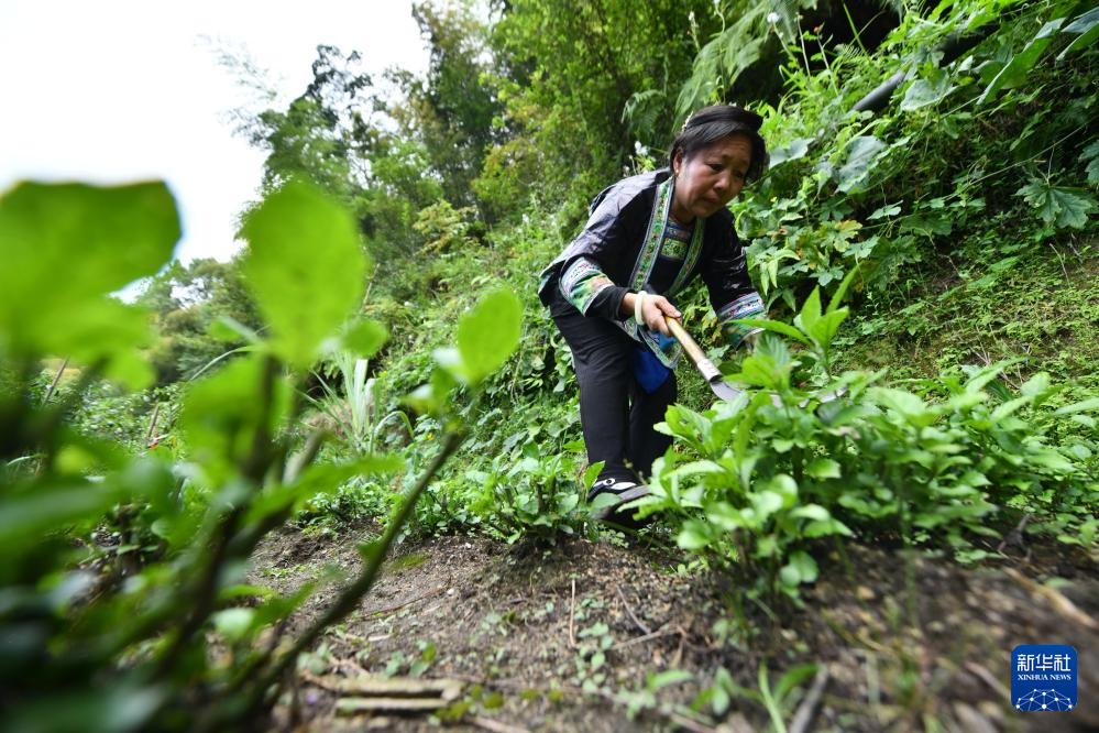 乌英苗寨妇女梁足英在山上收割蓝靛草(2023年8月29日摄)。