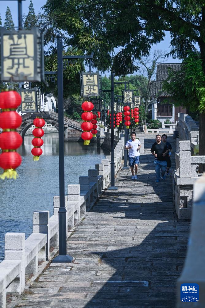 9月6日,慢跑爱好者在湖州市吴兴区织里镇组团跑步。
