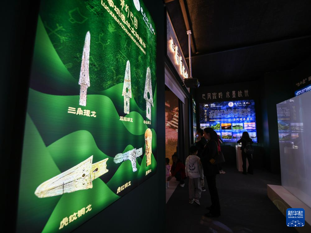 10月19日,在2023成都世界科幻大会主题展览上,参观者观看宣汉罗家坝遗址视频投影。