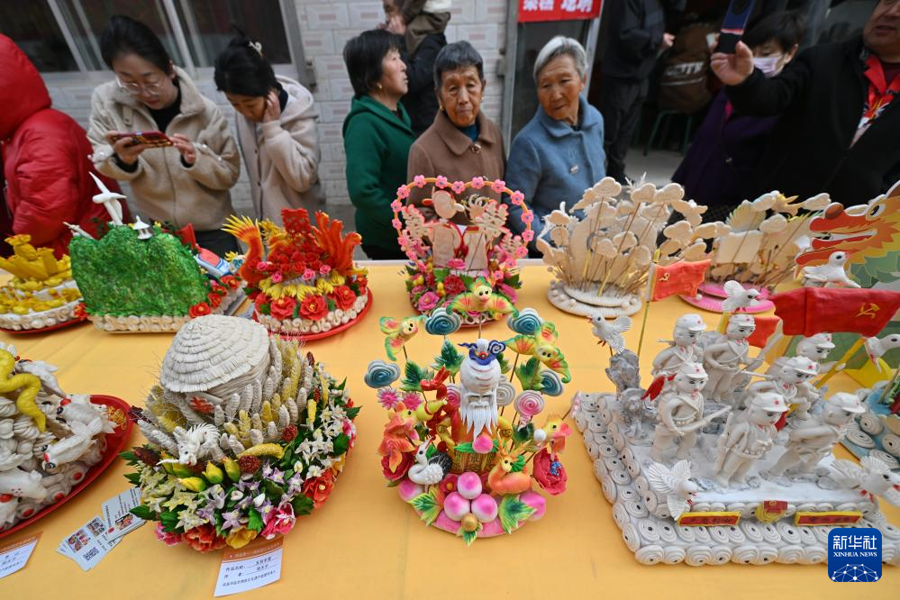 3月28日,在山西省岚县岚城镇,人们用手机拍摄面塑作品。