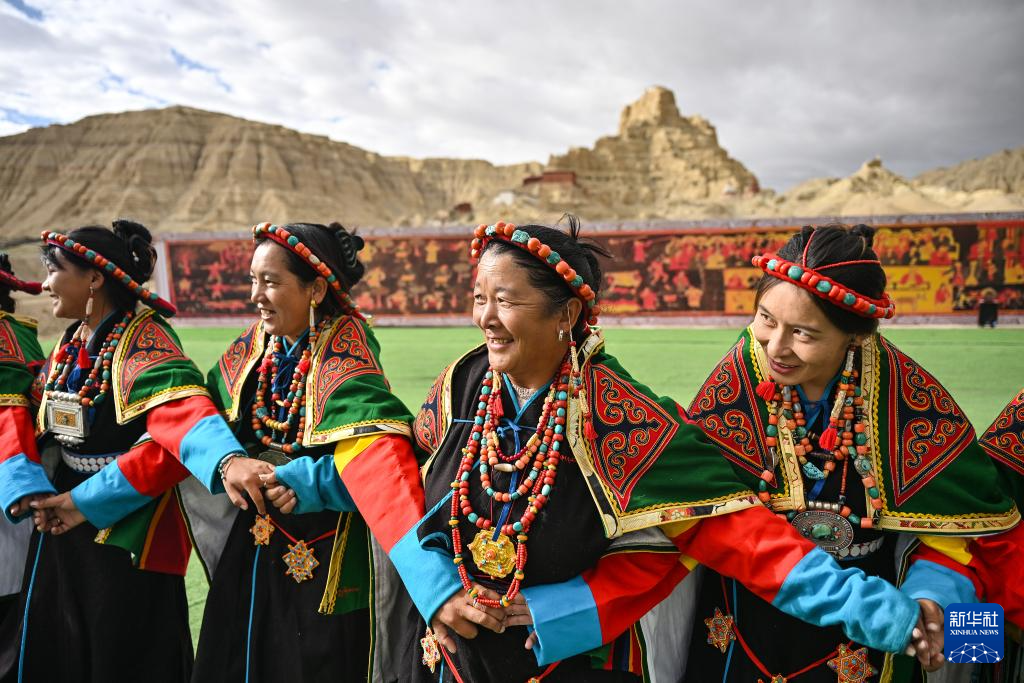 在西藏阿里地区札达县古格王国遗址脚下,当地村民表演“宣舞”后互相交流(9月11日摄)。
