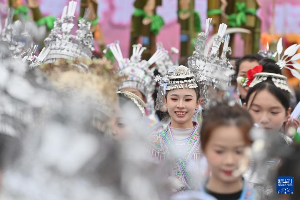 2月5日,苗族姑娘在融水苗族自治县杆洞乡百鸟衣芦笙坡会上进行民俗展演。