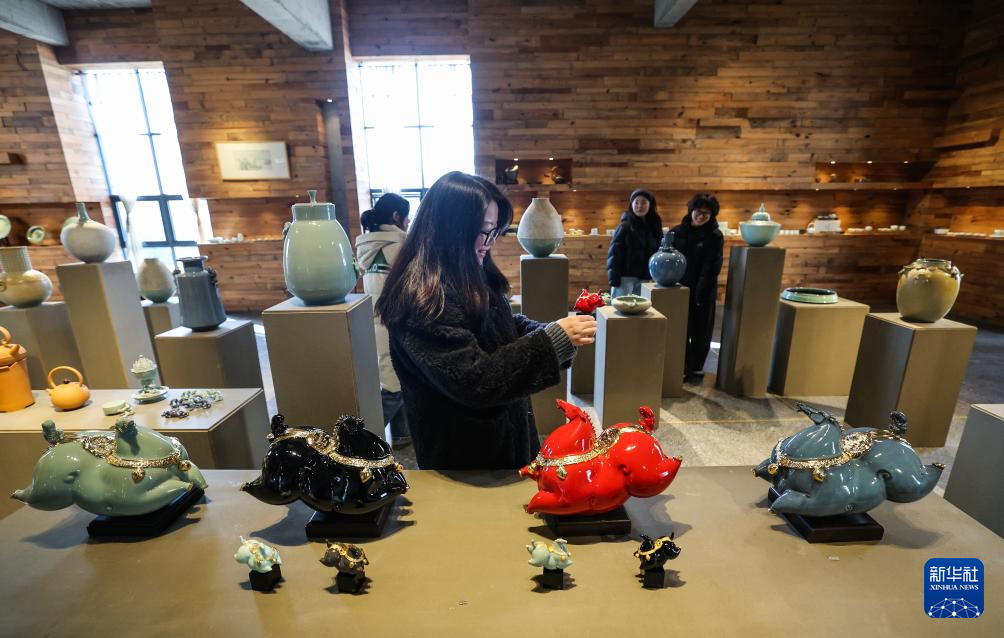 1月8日,游客在金华市金东区古婺窑火陶瓷文化艺术馆里欣赏婺州窑作品。