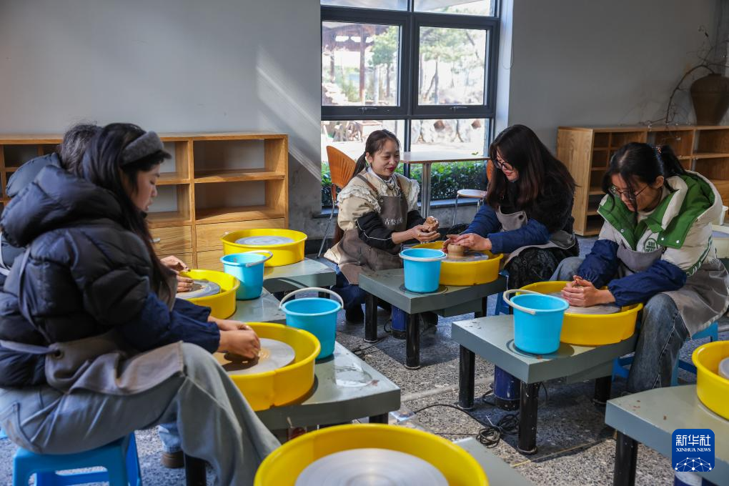 1月8日,游客在金华市金东区古婺窑火陶瓷文化艺术馆的体验区体验陶艺制作。