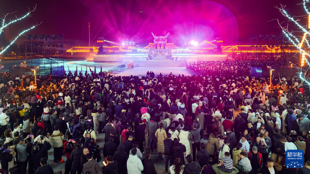 2月21日,游客在荆州楚文化数字产业园观看“荆州十二时辰·楚乐八百年”演出(无人机照片)。
