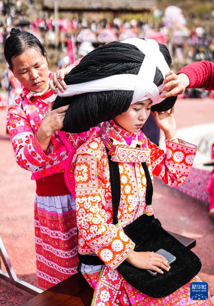 2月26日,在贵州省六盘水市六枝特区梭戛苗族彝族回族乡高兴村跳花场,苗族姑娘在整理头饰。