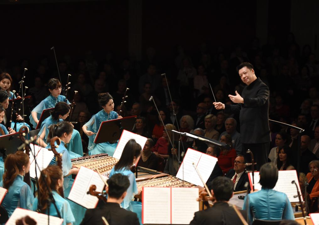 2026年2月26日晚,中国春节民族音乐会在奥地利首都维也纳举行,无锡民族乐团音乐总监兼首席指挥孙鹏(右上)在指挥演奏。新华社记者 贺灿铃 摄