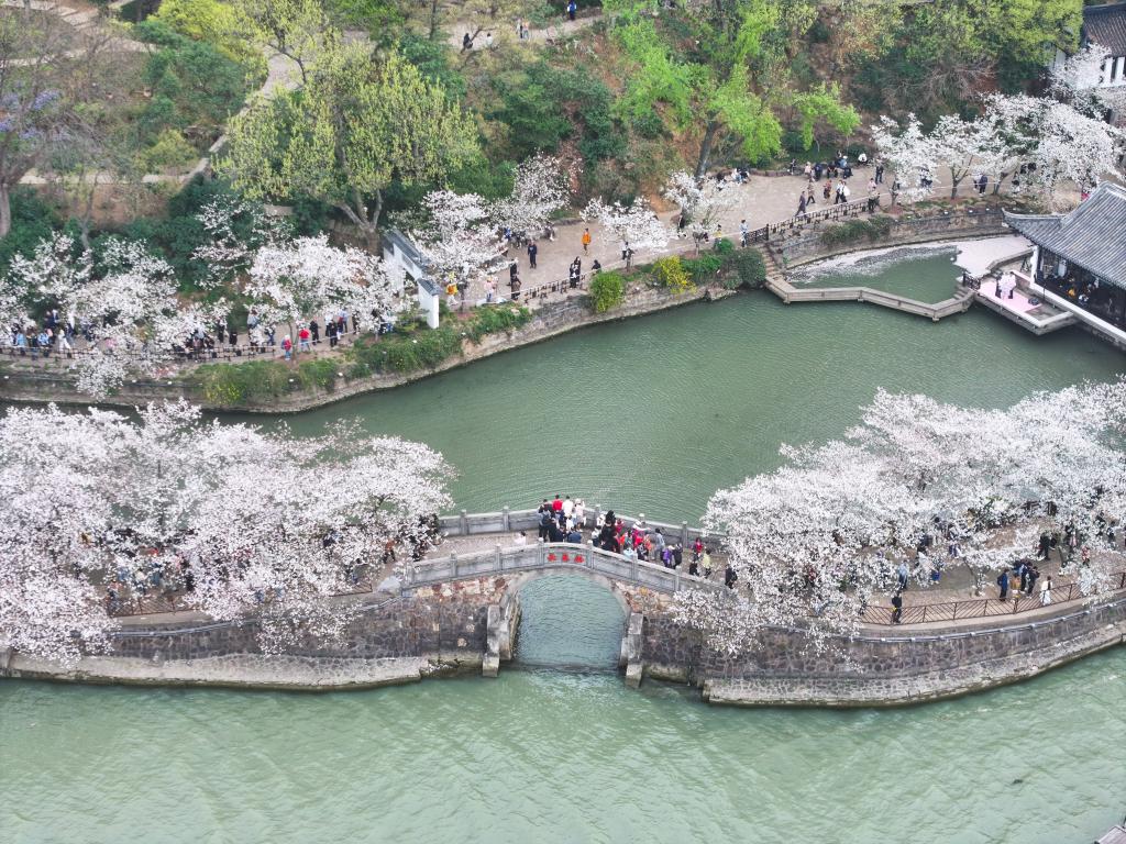 游人在无锡市太湖鼋头渚风景区观赏樱花(2025年3月27日摄,无人机照片)。新华社记者 季春鹏 摄