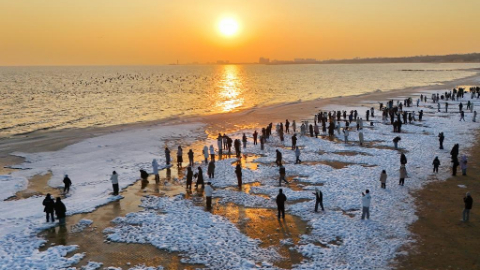 Tourists visit beach covered with sea ice in N China's Hebei