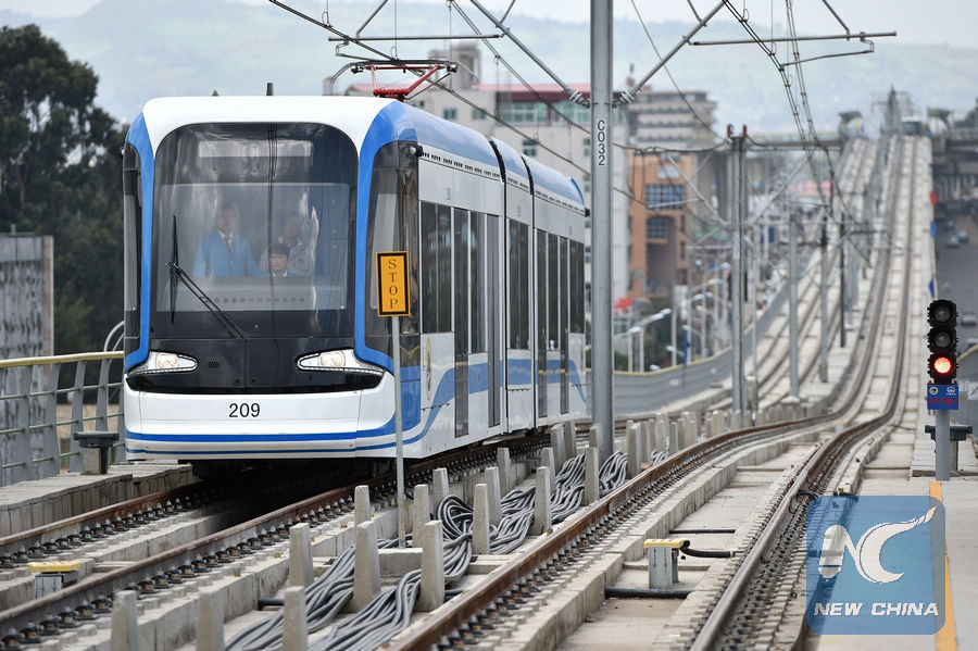 Photo taken on Sept. 20, 2015 shows a train operating on the light rail in Addis Ababa, Ethiopia. The electrified AA-LRT was the first light railway on the African continent with two lines of a total length of 34 km. The project, built by China Railway Group, became operational in September 2015. The rail service, estimated to transport about 60,000 passengers per day, helps ease people's travels in the Ethiopian capital. (Xinhua/Sun Ruibo)