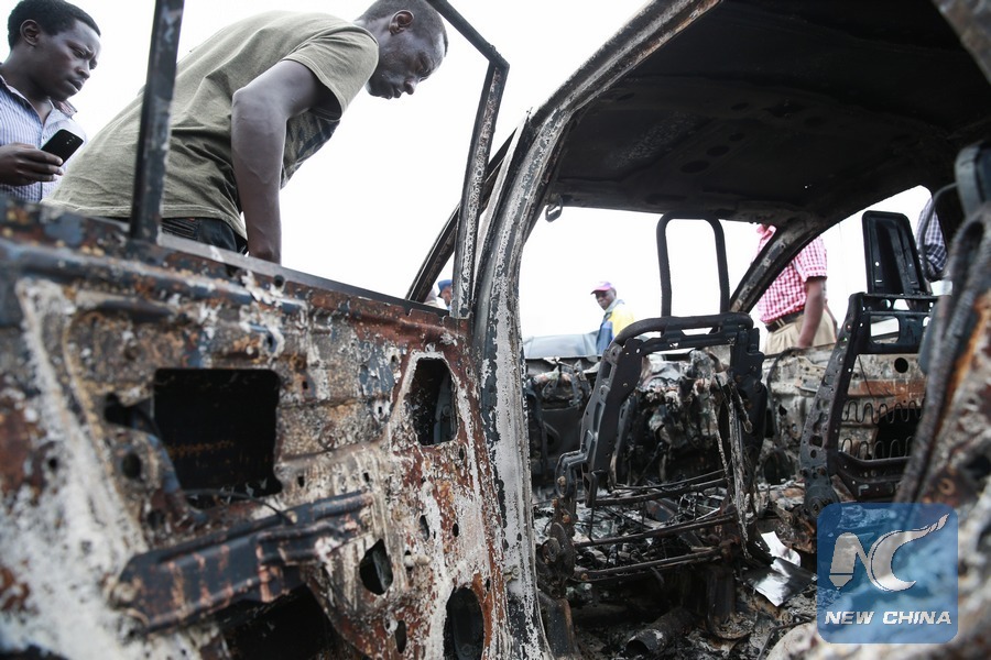 File photo shows local residents look at the wreckage of vehicles outside the town of Naivasha, Kenya, Dec. 11, 2016. (Xinhua/Pan Siwei)