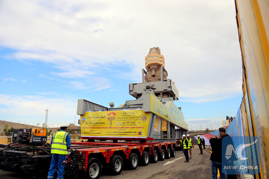 The moving process of King Ramses II colossus, covering a 400-meter distance, is carefully done by two heavy special vehicles amid a massive parade attended by officials from Egypt and other countries, archeologists, Egyptologists and diplomats.